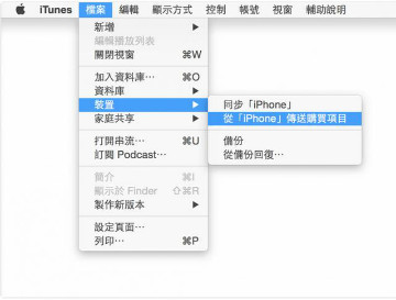 ▼而另一種是利用 iTunes,步驟如下。開啟 iTunes,然后將裝置連接到電腦。儲存您從 iTunes Store 或 App Store 上下載的內(nèi)容:按一下「檔案」>「裝置」>「傳送購買項目」。接著等待傳送結(jié)束。