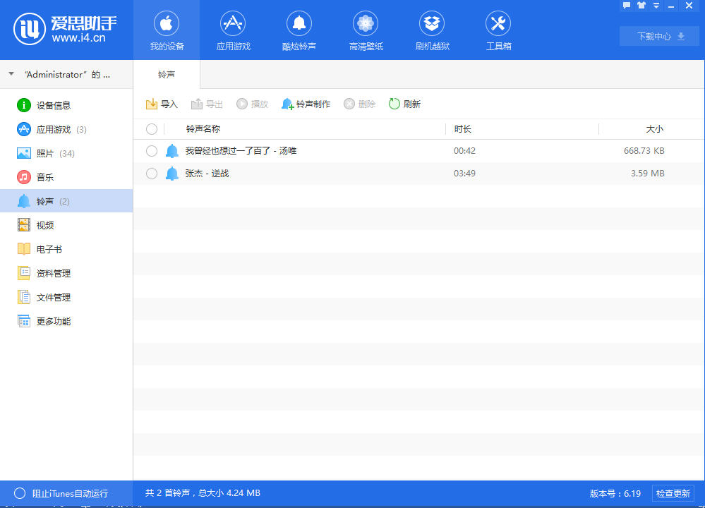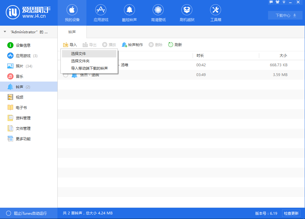 3. 點(diǎn)擊愛思助手左側(cè)欄中的【鈴聲】,可以導(dǎo)入你已經(jīng)下載好的鈴聲。
